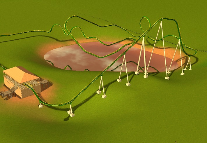 (beginning stages, there will be more scenery. I built the station and the roller coaster. Colors of the roller coaster, green, yellow and for the supports white.)