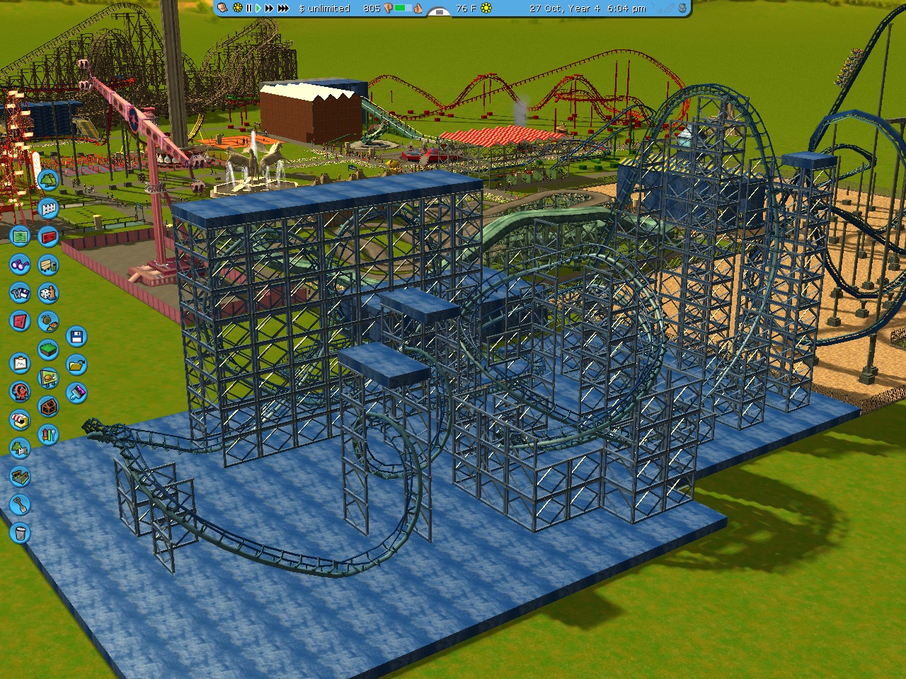This is what will soon be finished, a Megacoaster with BIZARRE supporting - hand - made. So buckle up for a ride on Chaos! A 106-foot lift hill pulls you up and up, until FINALLY you drop 103-Feet into a heavy Helix. Then a banking Turnaround pulls you into two G - Pulling loops. In the Finale you ride ANOTHER turnaround into two Corkscrews until you HIT THE BRAKES! Pics coming soon! Thanks for Feedback!