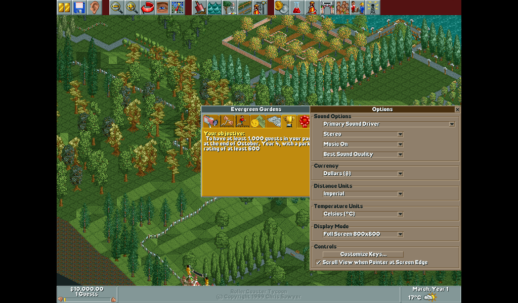 4. Now, launch RollerCoaster Tycoon and you should now be able to use your new resolution. The only catch is that the Options menu still displays the old resolution in the drop-down box. I have yet to figure out how to change that, but selecting it will actually change it to your new resolution.