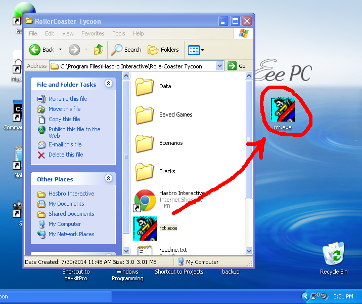 1. Make a backup copy of the original RCT.EXE file. If you accidentally mess up this file, you'll need to be able to restore it. It's located in "C:\Program Files\Hasbro Interactive\RollerCoaster Tycoon" ("Program Files(x86)" if you're using 64-bit Windows). Copy RCT.EXE to some place on your computer, such as the Desktop.