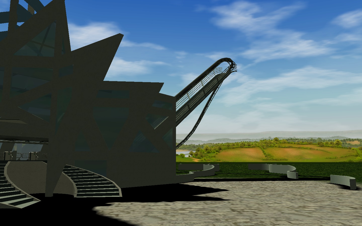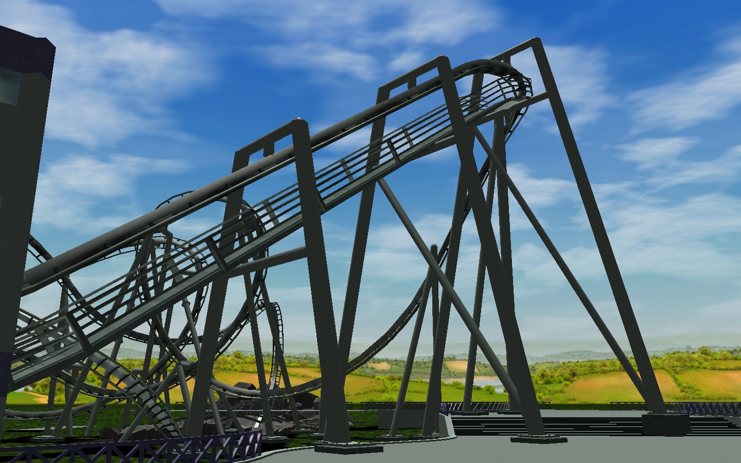 I like the style of this. It's kind of a modern - sci-fi style structure/coaster theme. I agree with Chris, a few color accents would work really well. I have a few custom scenery pieces I would recommend for you to try if you want to look at them.