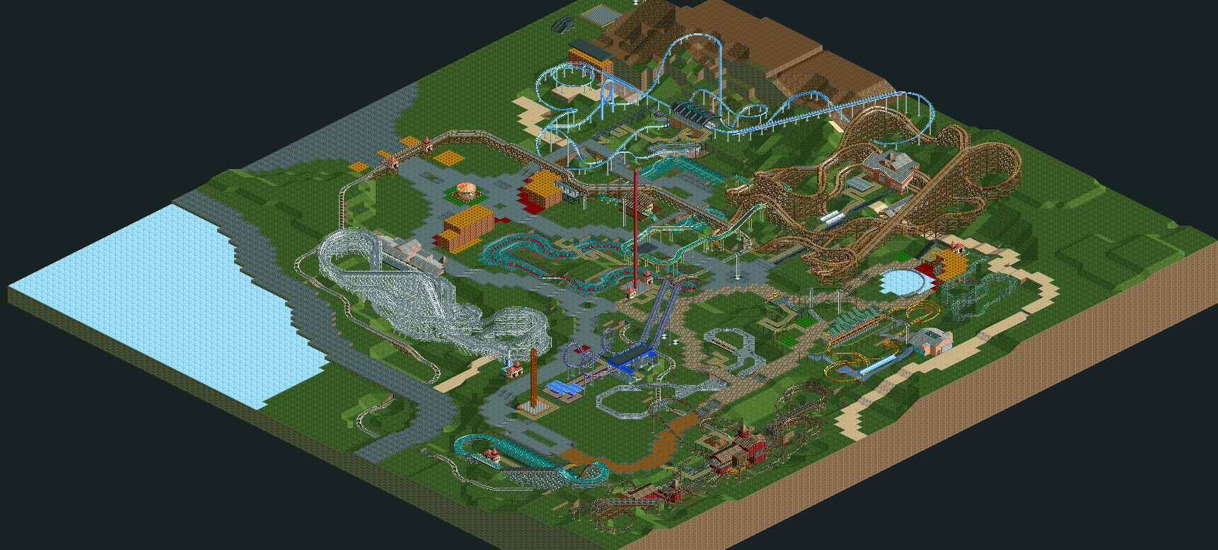 More of an "un-theme park", this gritty little small-town map began as an exercise in cramming rides together realistically in a difficult landscape without sacrificing aesthetics. The goal I've set is to feature 25 rides (at least 20 of them actually guest-accessible) and still retain the atmosphere of a quiet, small-town park. Should appear sometime in the first half of 2024.