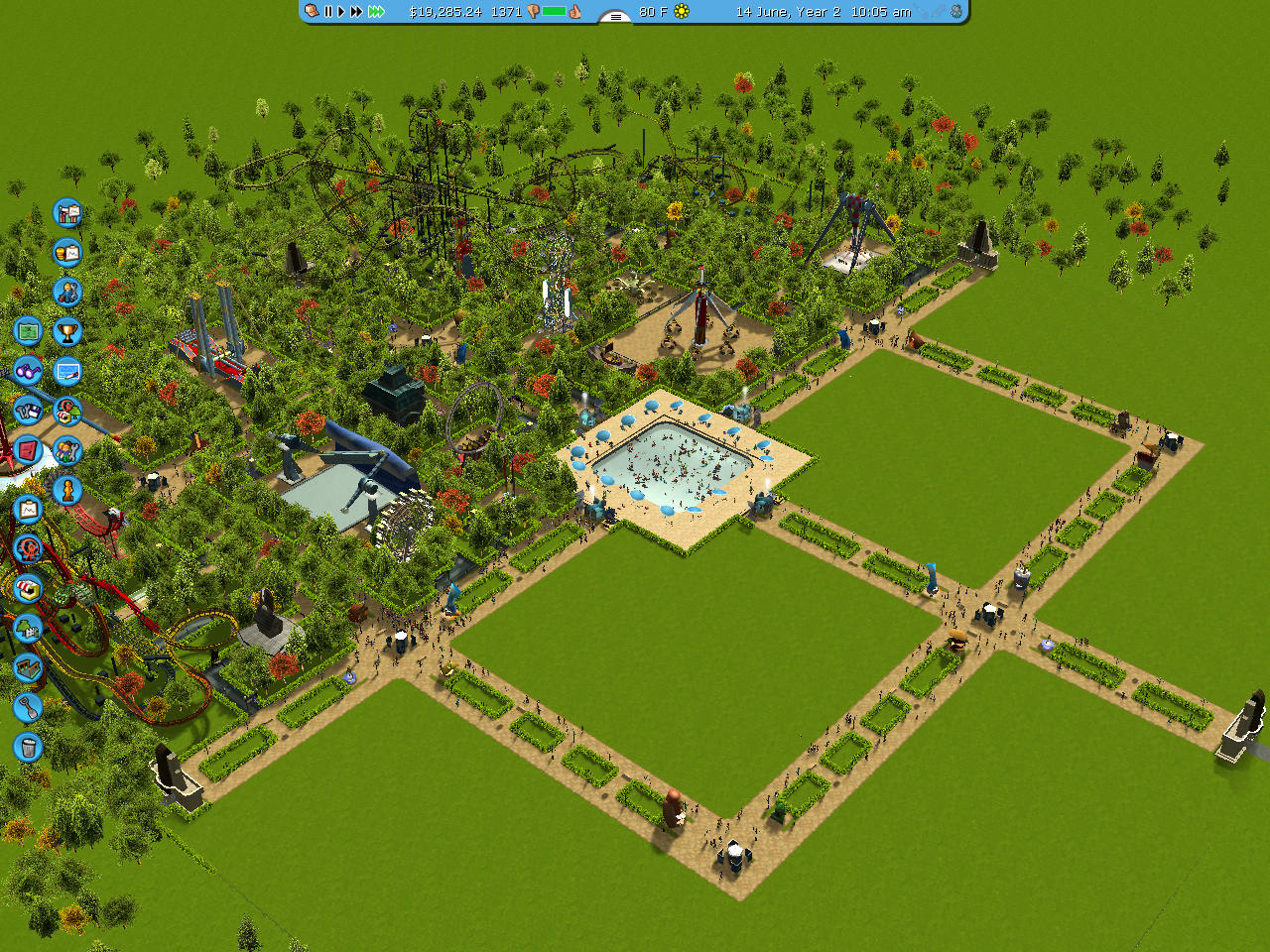 I have tried playing with Animal Enclosures and with Swimming Pools and I haven’t had a lot of luck with them. Maybe I’m just not very good at them yet, but the amount of space they take up for the amount of profit they generate isn’t great. For animal enclosures, once you start looking at the cost of feed and staff and take that away from the “apparent†income of the viewing galleries you realise that the profits aren’t great. With swimming pools it was the same trouble I had with the trains, if people like the pool then they spend a lot of time there instead of spending more money.