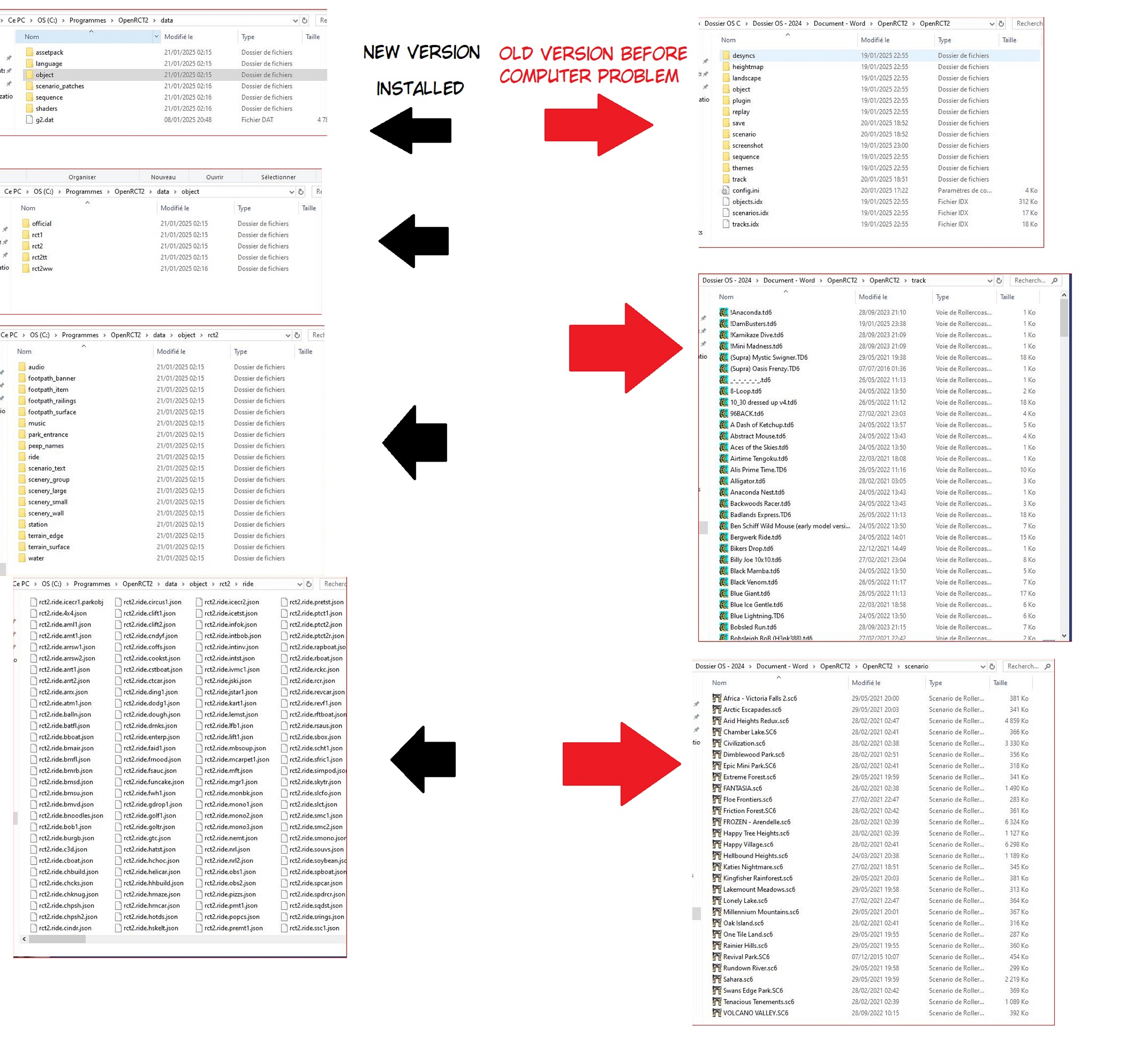 The main issue is that in the old OpenRCT 2 folder, there used to be subfolders like "tracks" and "scenario". These two are now missing. Why am I bringing this up? Because this site allows you to add new attractions, scenarios, maps, and more. I had saved the "tracks" I downloaded on an external drive, thinking that by simply re-adding them, the game would register them automatically… but no, nothing works.