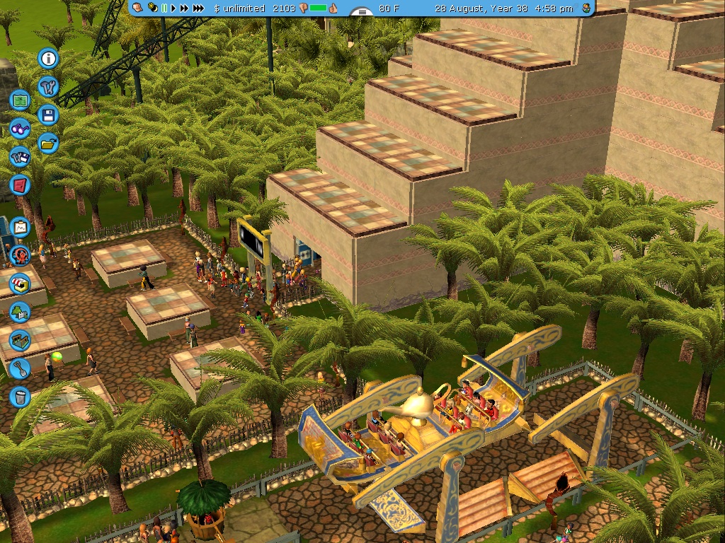 3. A new land was called the Rainforest, it has a new roller coaster called Temple Adventure. And four more coasters: Jungle Treck(a monster truck coaster), Snake Twirlers ( a Virginia Reel Coaster), The Hawk (an inverted coaster), and Jungle River Rapids (a river rapids water coaster. Rides include the 4-D movie called Wonders of Nature, Phoenix Flyer (renamed from the thrill ride given by rct3).The hotel will be moved near this area.