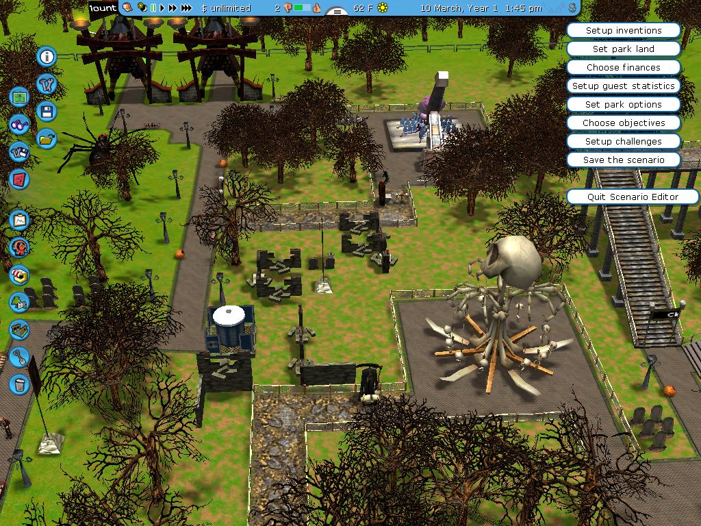 Ok, here is the park im working on for the past day or 2, that goes with the castles i released for yall, i got 3 screen shots , lots of scenery in this park, few castles, got a nice good woodie coaster that goes with the theme, and some other spooky rides. *full efect this will require murs dark ride set* other wise you wont see the spiders and such in the park, but i made sure the castles are made from original walls.