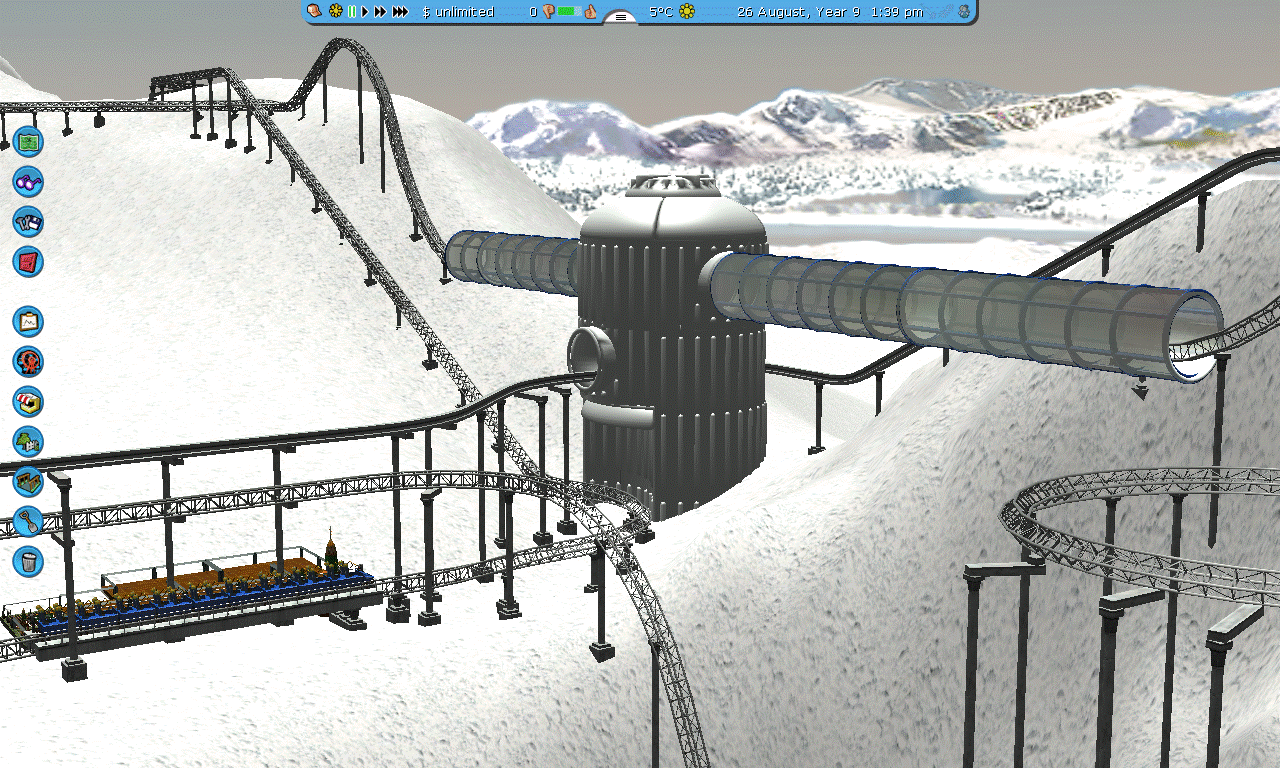 At least the main amusement areas are indoor. The longuest building is approx. 650 meters long and up to 50 meters of vertical clearance. You could almost fit the mothership from Space Simulator in there! I still have to fill it with thrill rides and I'm not sure there's enough rides available in the menu. Somebody should create custom rides. Wish I could.